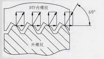DTFLOCK螺母在內(nèi)螺紋的牙底處有一個(gè)30°的楔形斜面,當(dāng)螺栓、螺母擰緊時(shí),螺栓的牙尖就緊緊地頂在螺母的楔形斜面上,從而產(chǎn)生了很大的鎖緊力。由于牙形的角度改變,使施加在螺紋間接觸所產(chǎn)生的法向力與螺栓軸成60°角(見圖2),而不是像普通螺紋那樣的30°角,DTFLOCK螺紋法向壓力遠(yuǎn)遠(yuǎn)大于扣緊壓力,因此,所產(chǎn)生的防松摩擦力也就必然大大增加了。